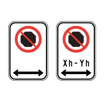 Les panneaux «Arrêt interdit» (P-160-1-G-D) indiquent qu’il est interdit d’arrêter à l’endroit signalé par le panneau.