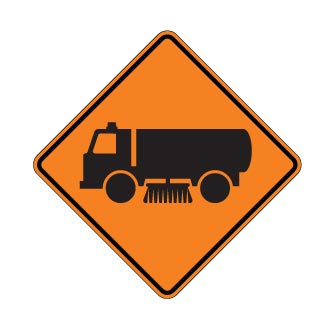 Le panneau « Balai automoteur » (T-50-16) indique la présence d’un balai automoteur effectuant des travaux sur une voie de circulation ou aux abords de celle-ci.