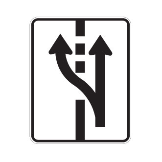 Le panneau «Début de sens unique» (P-80-2) indique, sur un chemin public à double sens, la fin de la circulation à double sens et le début de la circulation dans un sens seulement.