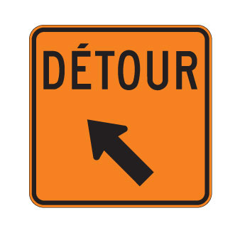 Le panneau « Détour » (T-90-10-G) indique la direction de l’itinéraire de détour prévu que doivent suivre les usagers de la route en raison des travaux.