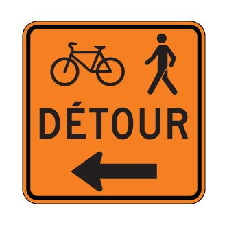 Le panneau « Détour pour piétons et cyclistes » (T-90-13-G) indique la direction du détour à suivre par les piétons et les cyclistes en raison de travaux.