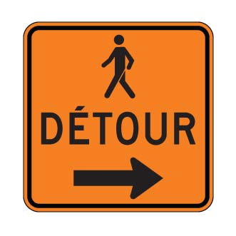 Le panneau « Détour pour piétons » (T-90-16-D) indique la direction du détour à suivre par les piétons en raison de travaux.