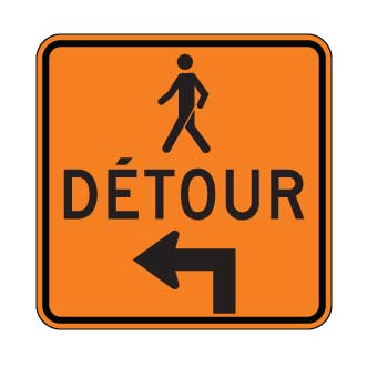 Le panneau « Détour pour piétons » (T-90-18-G) indique la direction du détour à suivre par les piétons en raison de travaux.