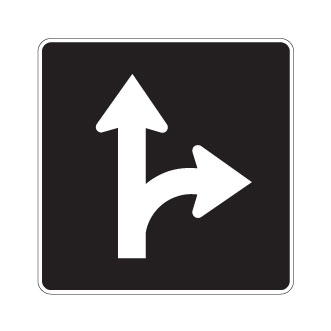 Le panneau « Direction des voies » (P-100-3-D) indique, pour la voie visée, d’aller tout droit ou de tourner à droite.