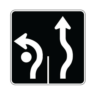 Le panneau « Direction des voies » (P-105-2) installé à l’approche d’un carrefour giratoire à voies multiples indique qu’on doit se ranger dans la voie de gauche pour tourner à gauche ou dans la voie de droite pour aller tout droit.