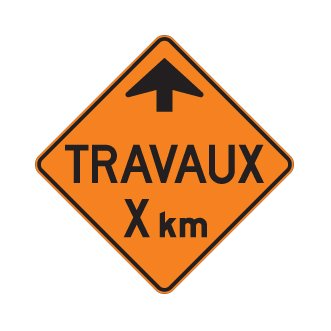 Le panneau « Distance à parcourir avant d’atteindre l’aire de travail » (T-20) indique, à l’avance, à quelle distance de ce panneau se trouve une aire de travail.