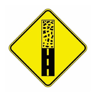 Le panneau «Fin du revêtement» (D-350) indique l’approche de la fin d’une chaussée avec revêtement et le commencement d’une autre en gravier ou en terre.