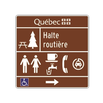 Le panneau « Halte routière – permanente » (I-420-3) indique l’entrée d’un endroit ouvert pendant toute l’année et aménagé le long d’une autoroute pour les automobilistes qui souhaitent se reposer.