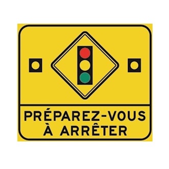 Le panneau « Préparez-vous à arrêter » (D-60-1) indique à l’avance la proximité d’une intersection comportant des feux de circulation et, par le clignotement des feux jaunes, que ces feux passeront au rouge avant que cette intersection soit atteinte.