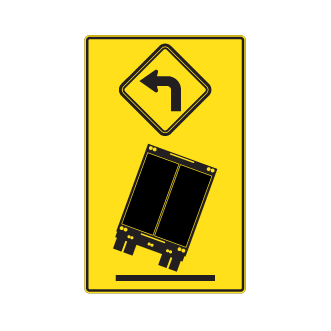 Le panneau D-110-7 « Renversement de camion » indique à l’avance la proximité d’une courbe comprenant une géométrie dont le risque de renversement est probable pour un véhicule dont le centre de gravité est élevé.