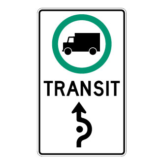 Le panneau « Trajet obligatoire pour les camions circulant en transit dans un carrefour giratoire » (P-120-38) indique aux conducteurs de véhicules circulant en transit de suivre le sens des flèches giratoires.
