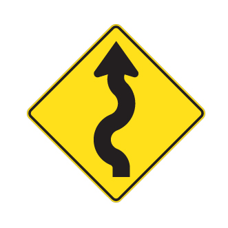 Les panneaux « Virages » (D-110) indiquent la proximité d’une ou de plusieurs courbes sur un chemin public. Le panneau D-110-5-G indique un virage triple débutant vers la gauche.